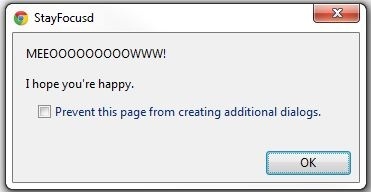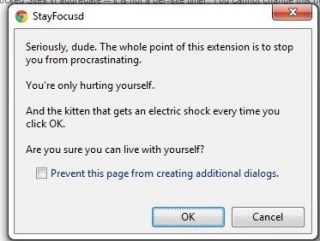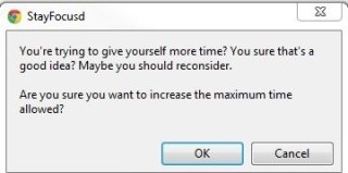 One awesome/cute aspect of the web application is that it knows whether you are trying to “hack” it when you change settings. For instance, if I try to raise my “Maximum Time Allowed Per Day,” StayFocusd will prompt a series of dialogue boxes with the following: