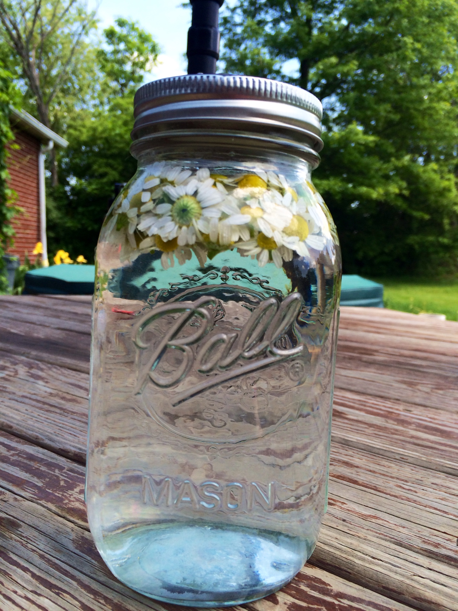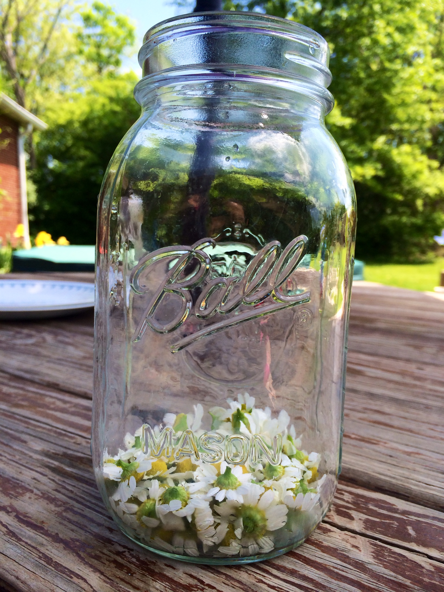 You can use the flowers you removed from the mason jar to make hot chamomile tea. Place the flowers in a saucepan, fill the pan with 32 oz. of water, and bring to a boil. The water will begin to change color, and it depends how strong you like your tea, as to when you want to turn off the burner. I then scoop out the flowers to add to our compost pile.