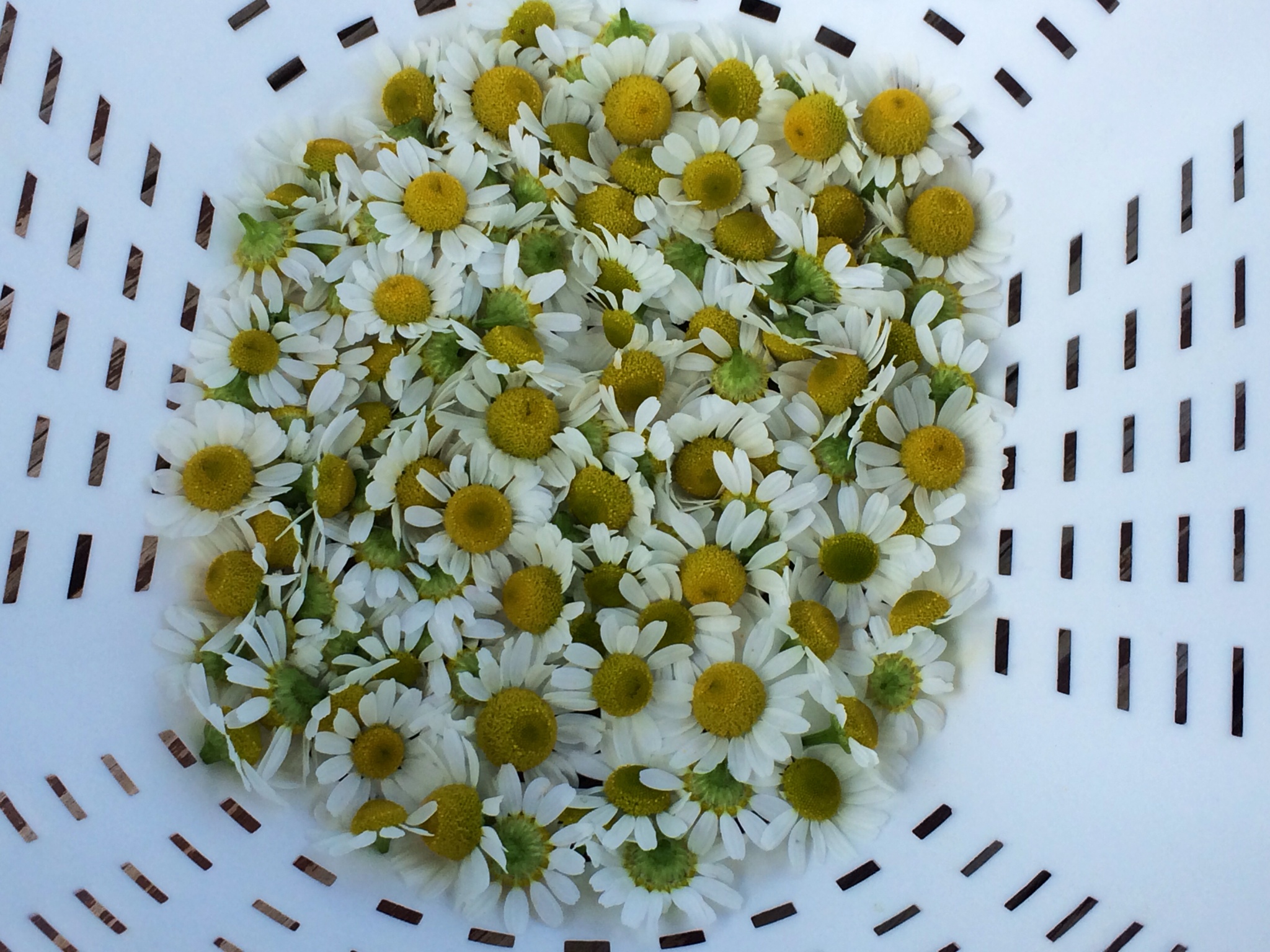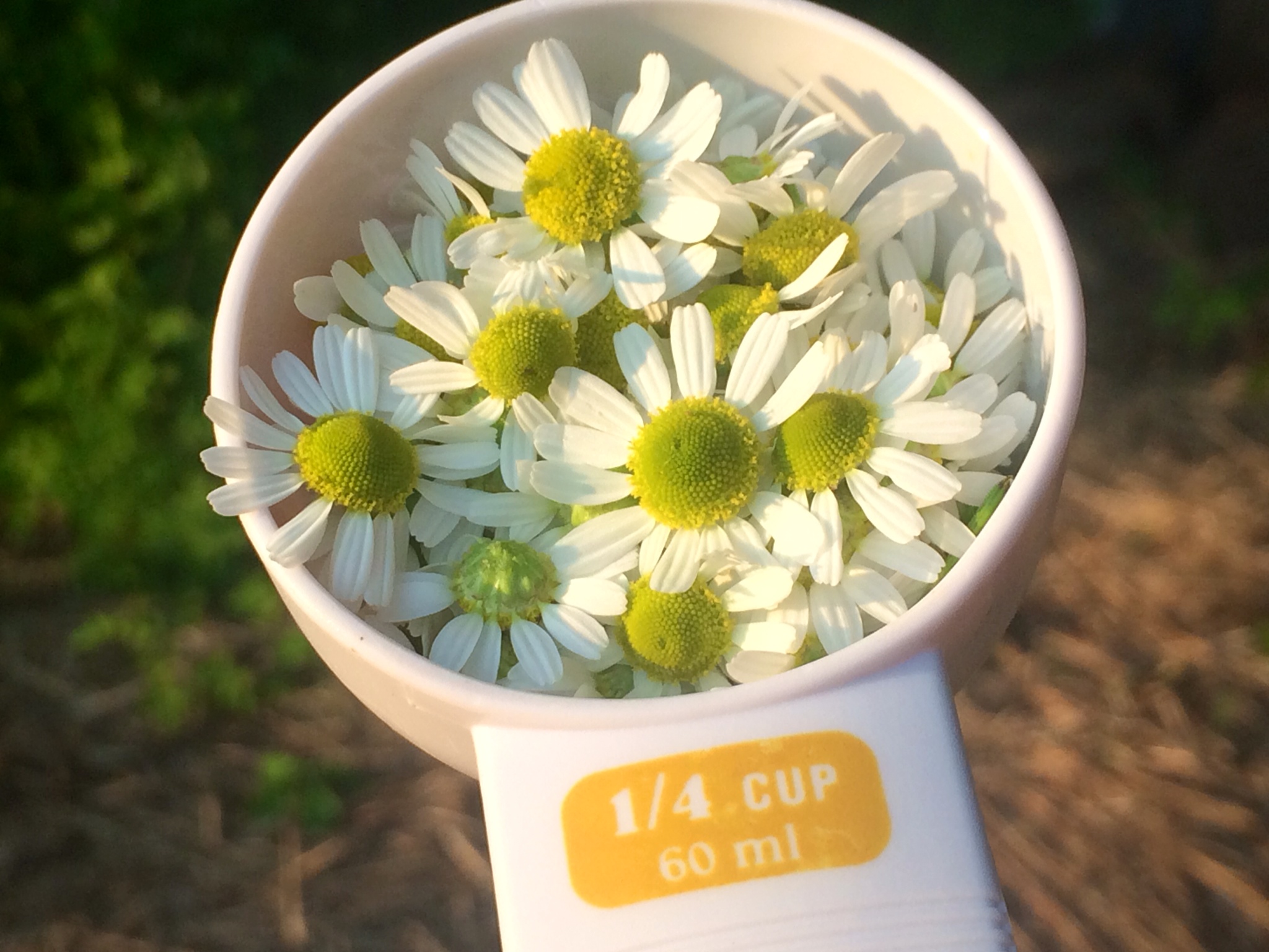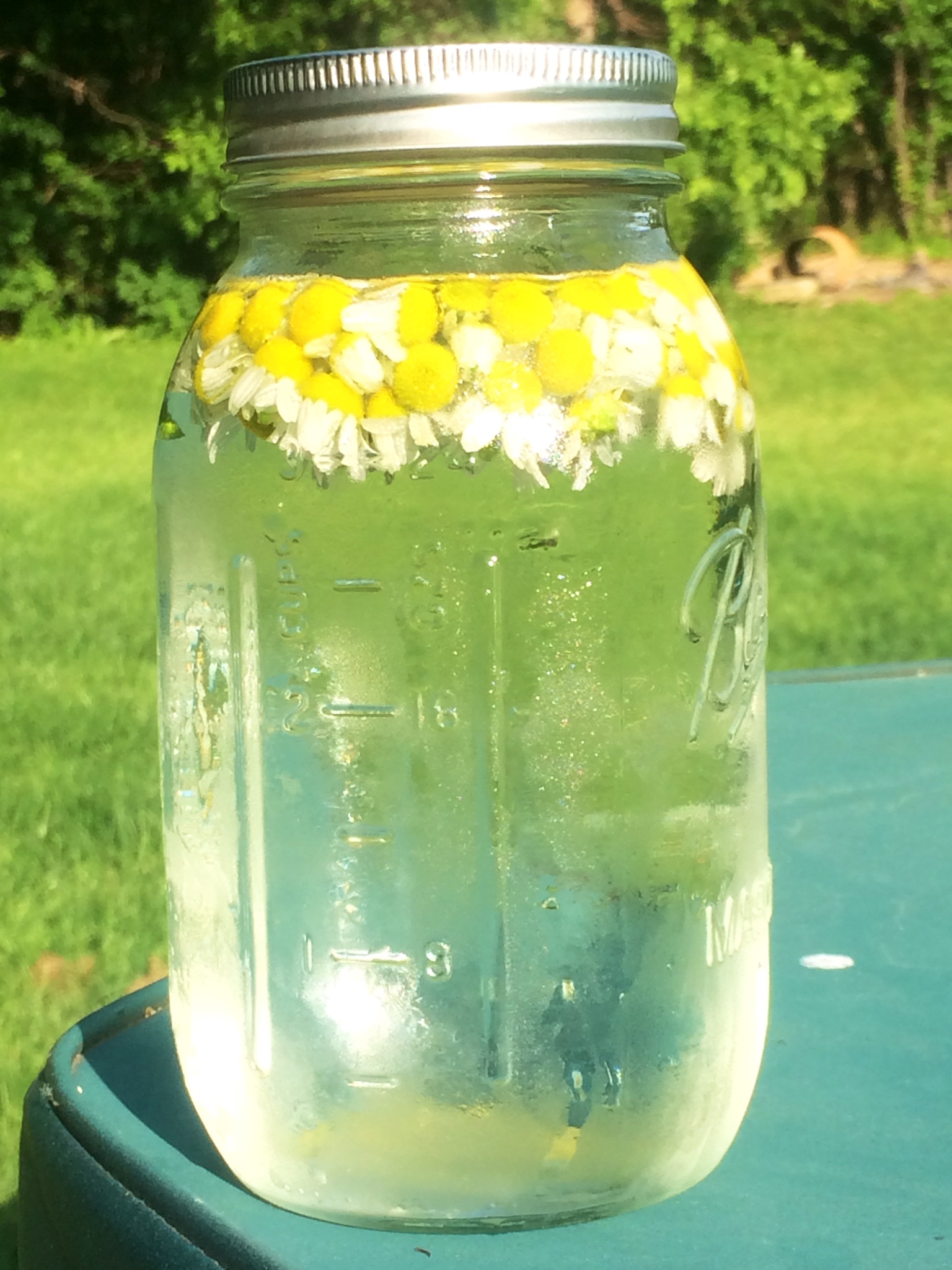 Along with my husband, I’ve made a conscious effort to cut sugary sodas and other drinks out of my diet. Although we’ll occasionally drink Sprite or ginger ale, for the most part we stick with water and tea. Water is the best thing we can drink, and it’s fun to flavor it to help meet hydration goals. We grow herbs that can be used to brew fresh teas such as nettle, lemon balm, and chamomile, and a couple weeks ago discovered the chamomile flowers can be used to flavor water in a cold infusion. Chamomile is easy to grow (in fact, you want to plant it somewhere you don’t mind it spreading), and the cold infusion is a snap to make.
